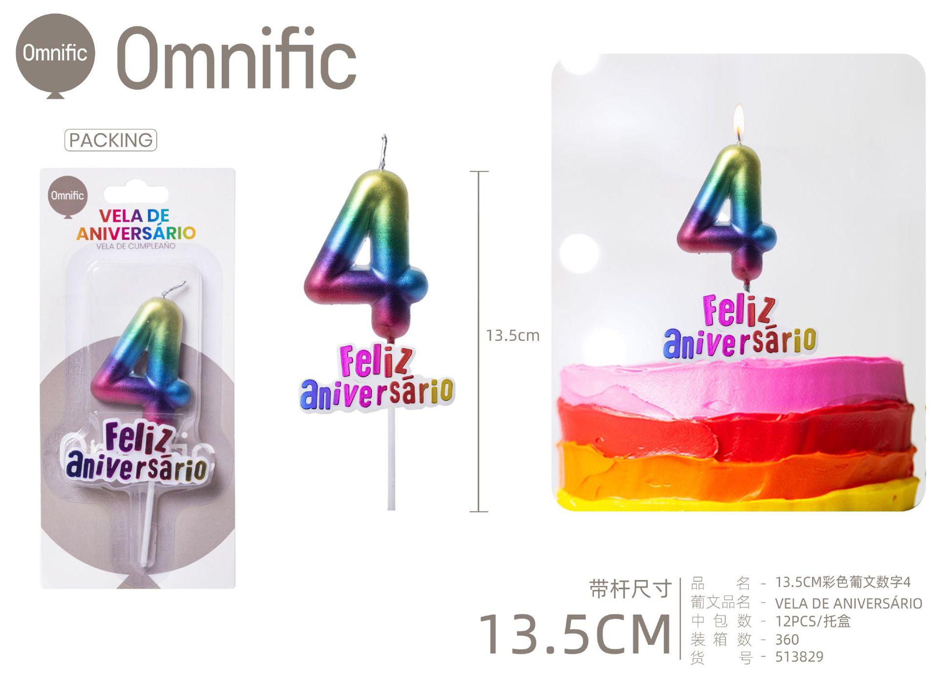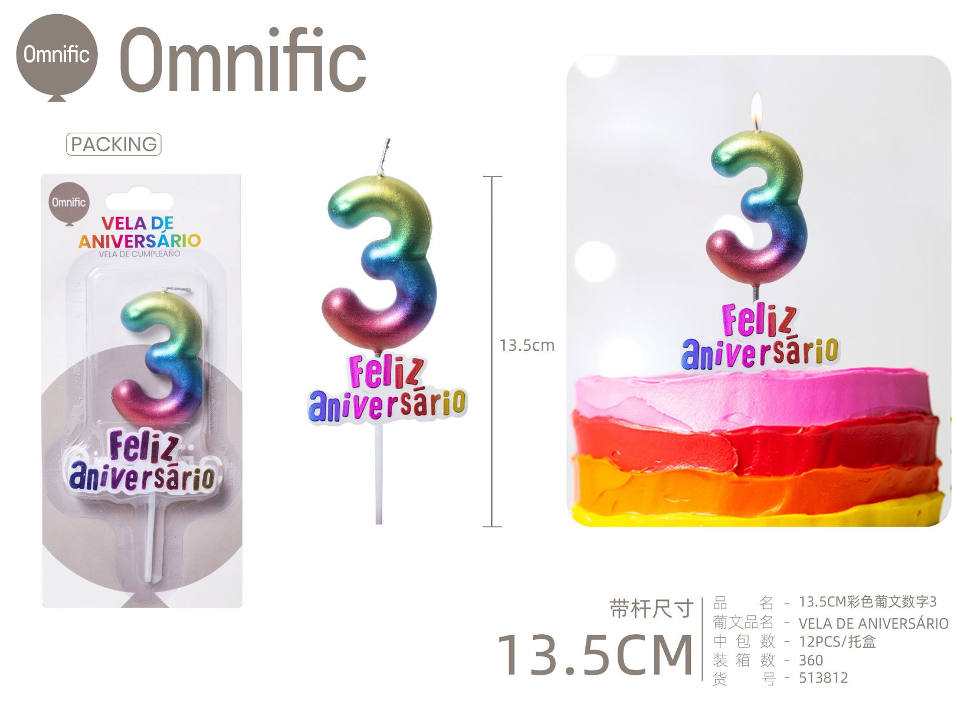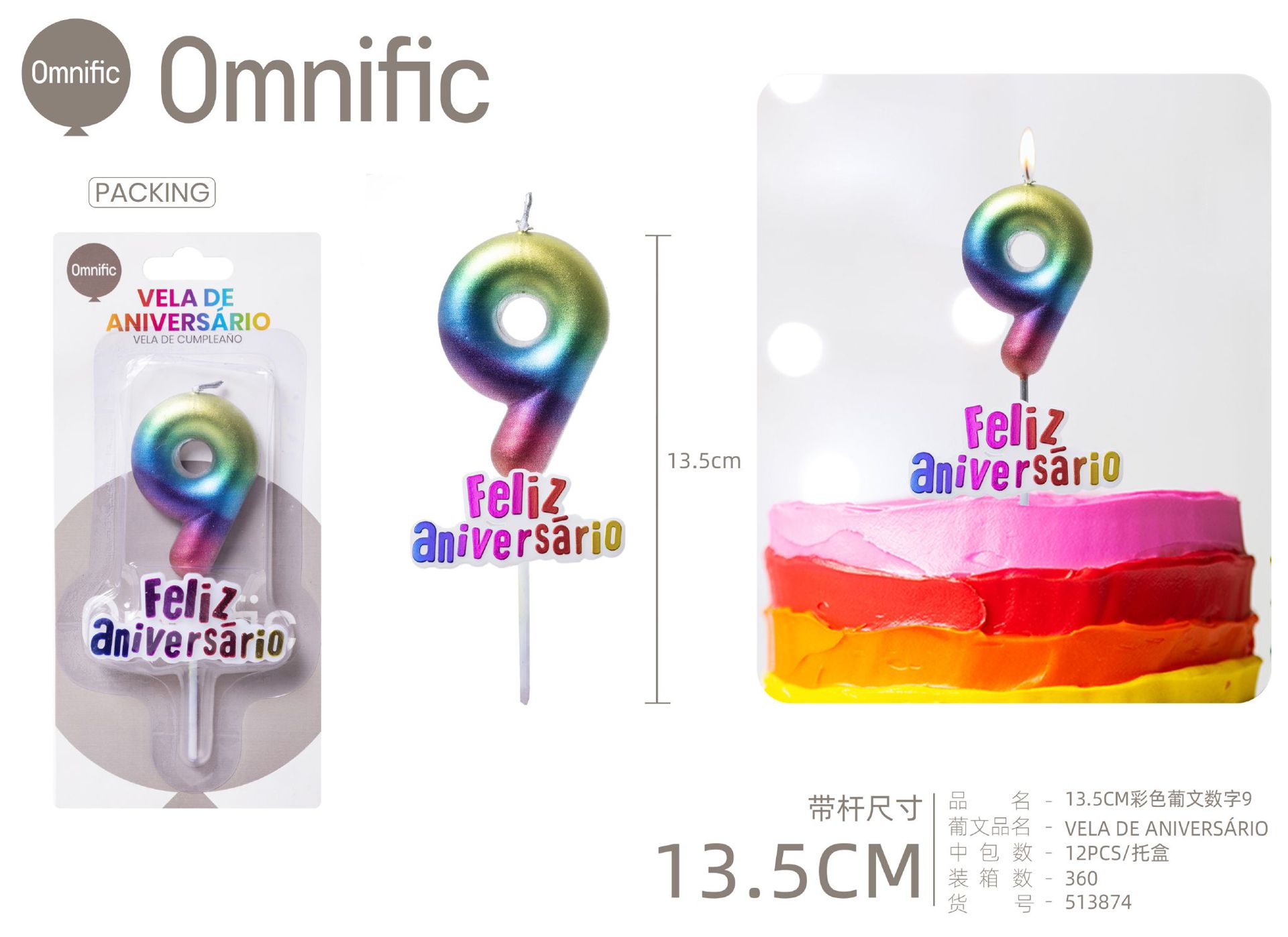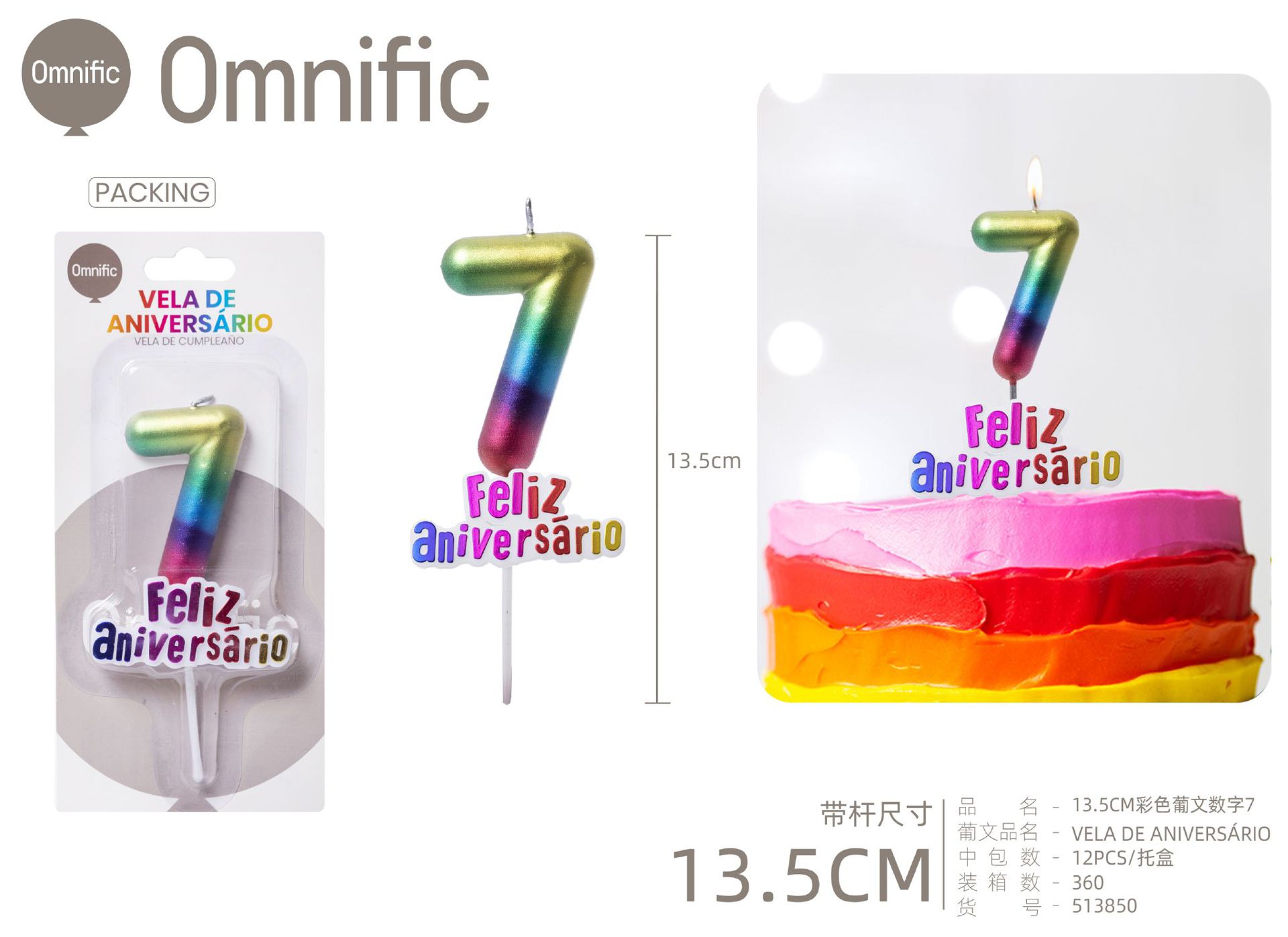 VELA NUMÉRICA METÁLICA ARCO-ÍRIS COM TEXTO 9CM