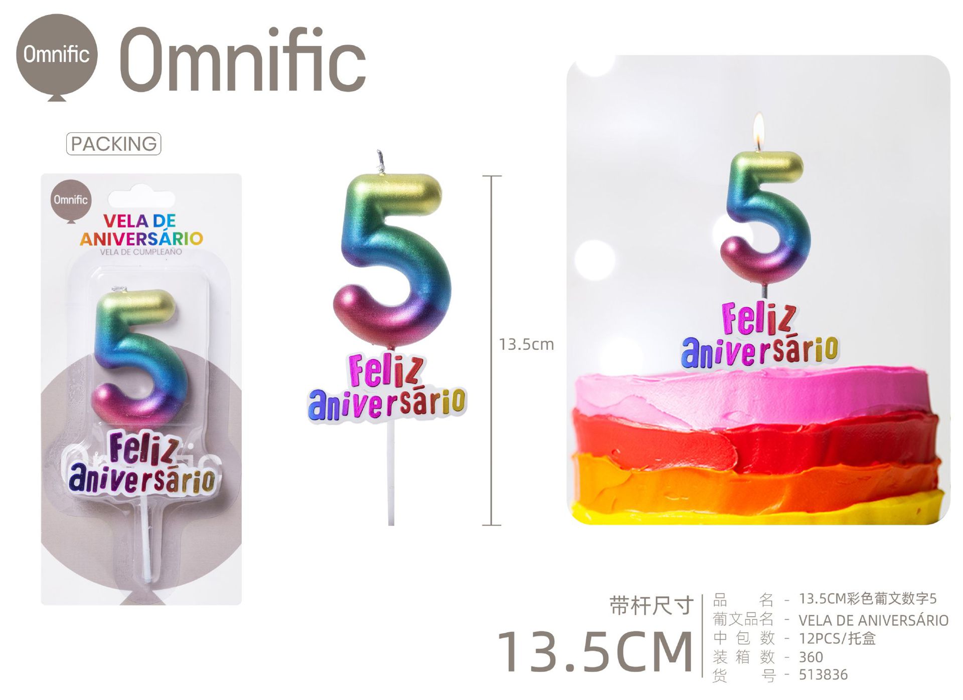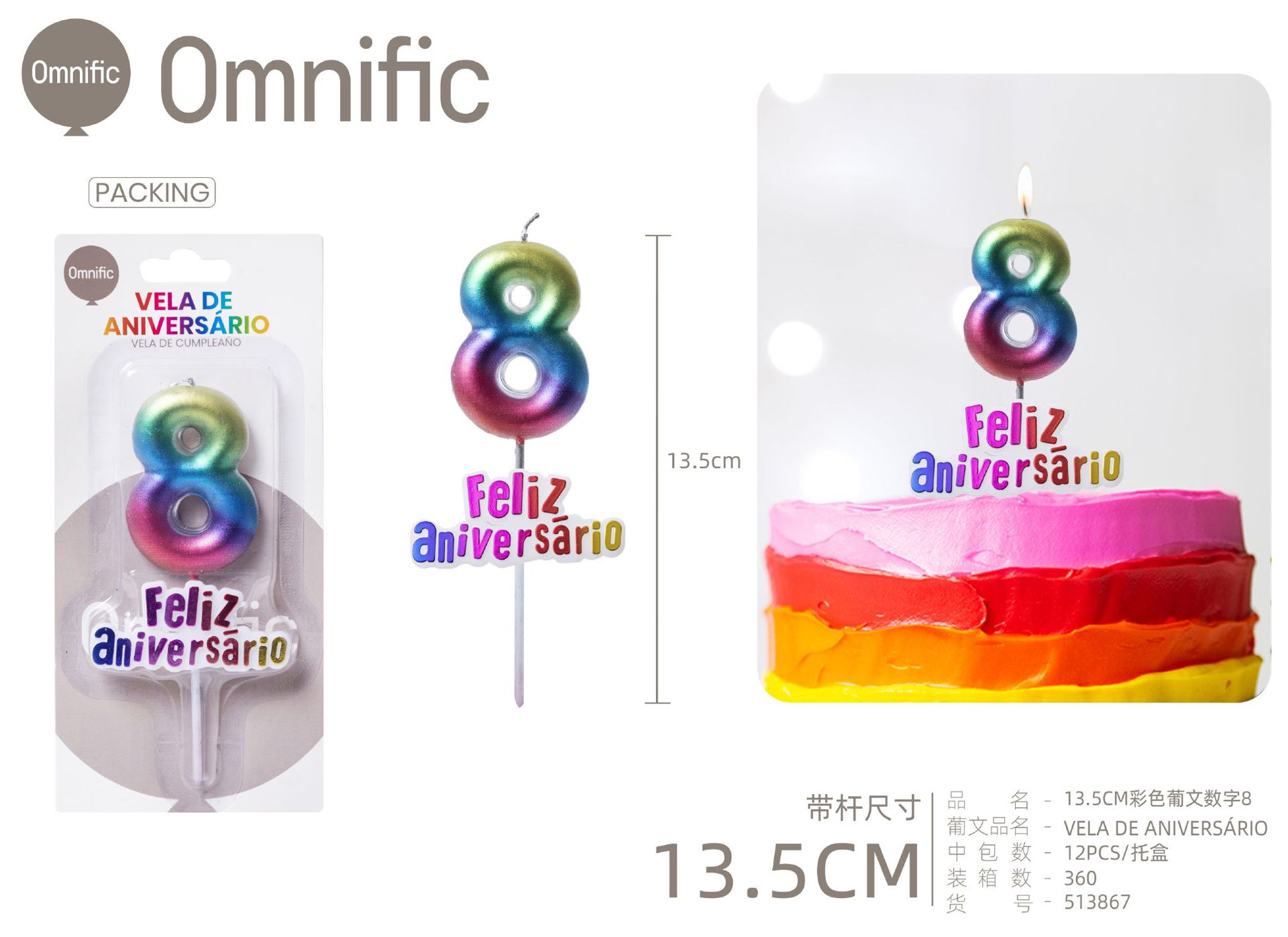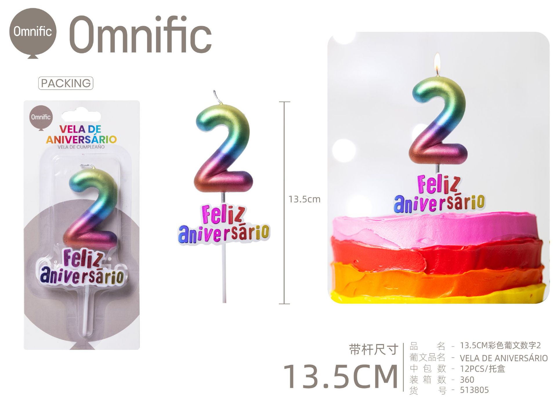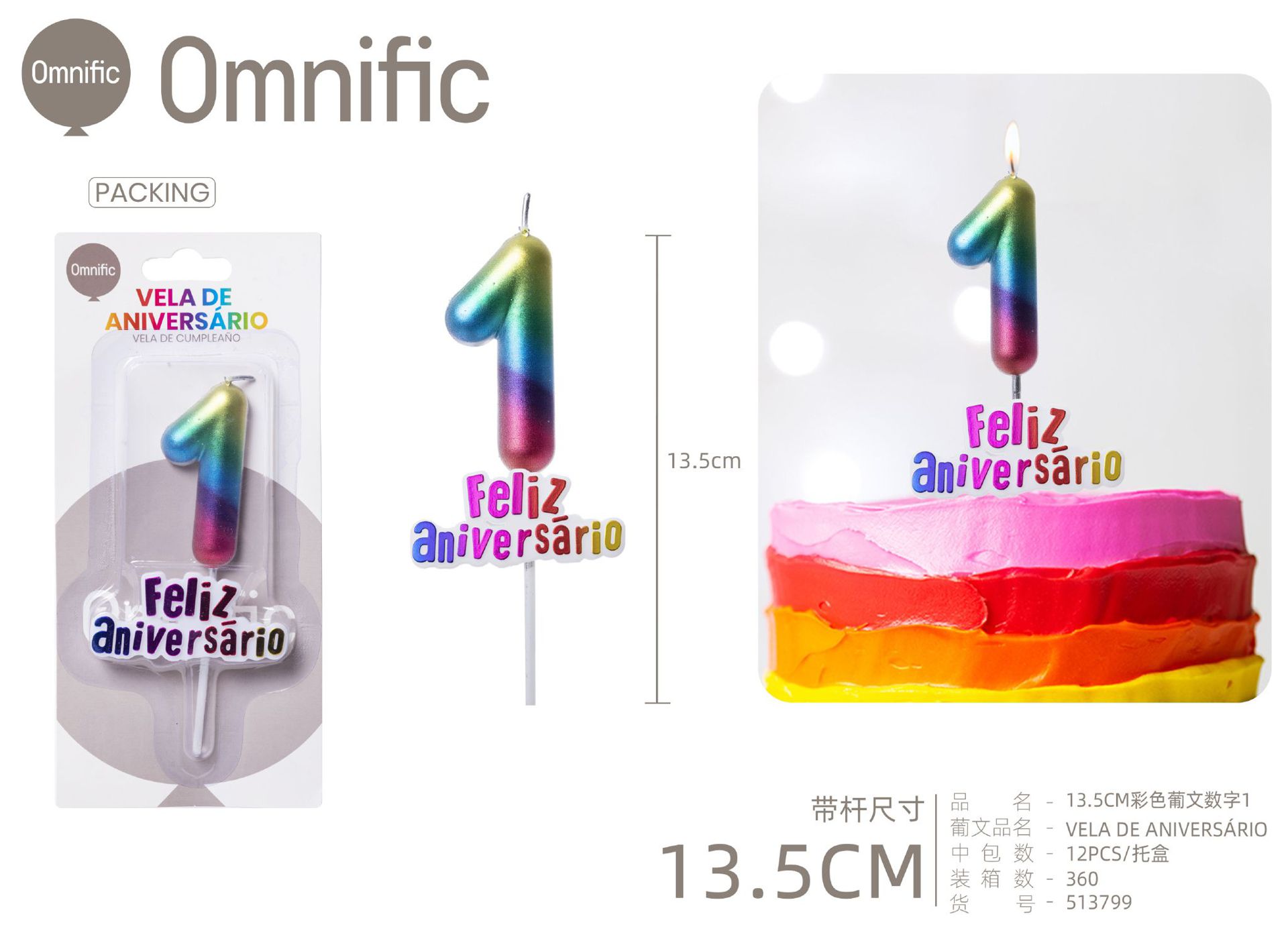 VELA NUMÉRICA METÁLICA ARCO-ÍRIS COM TEXTO 9CM
