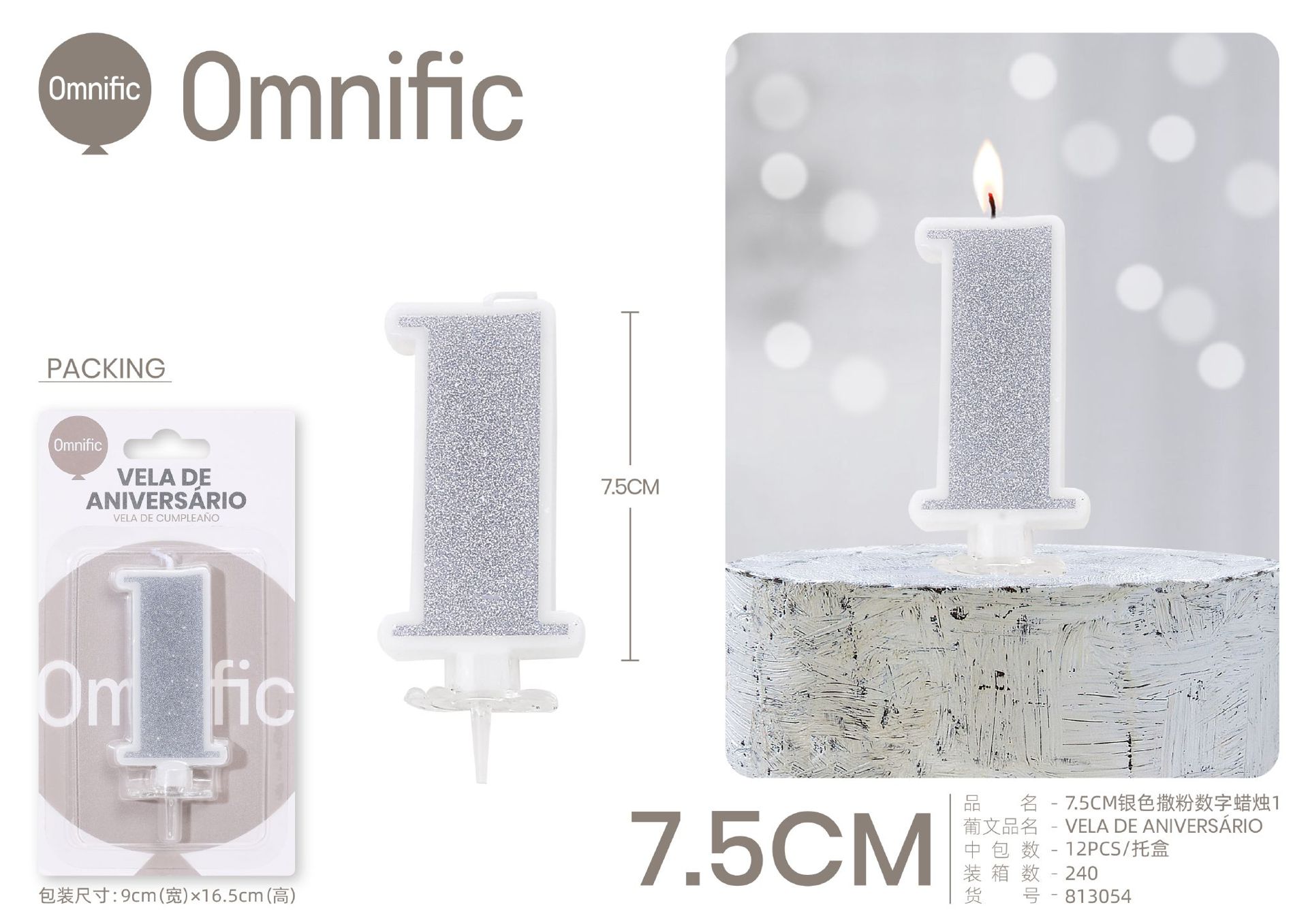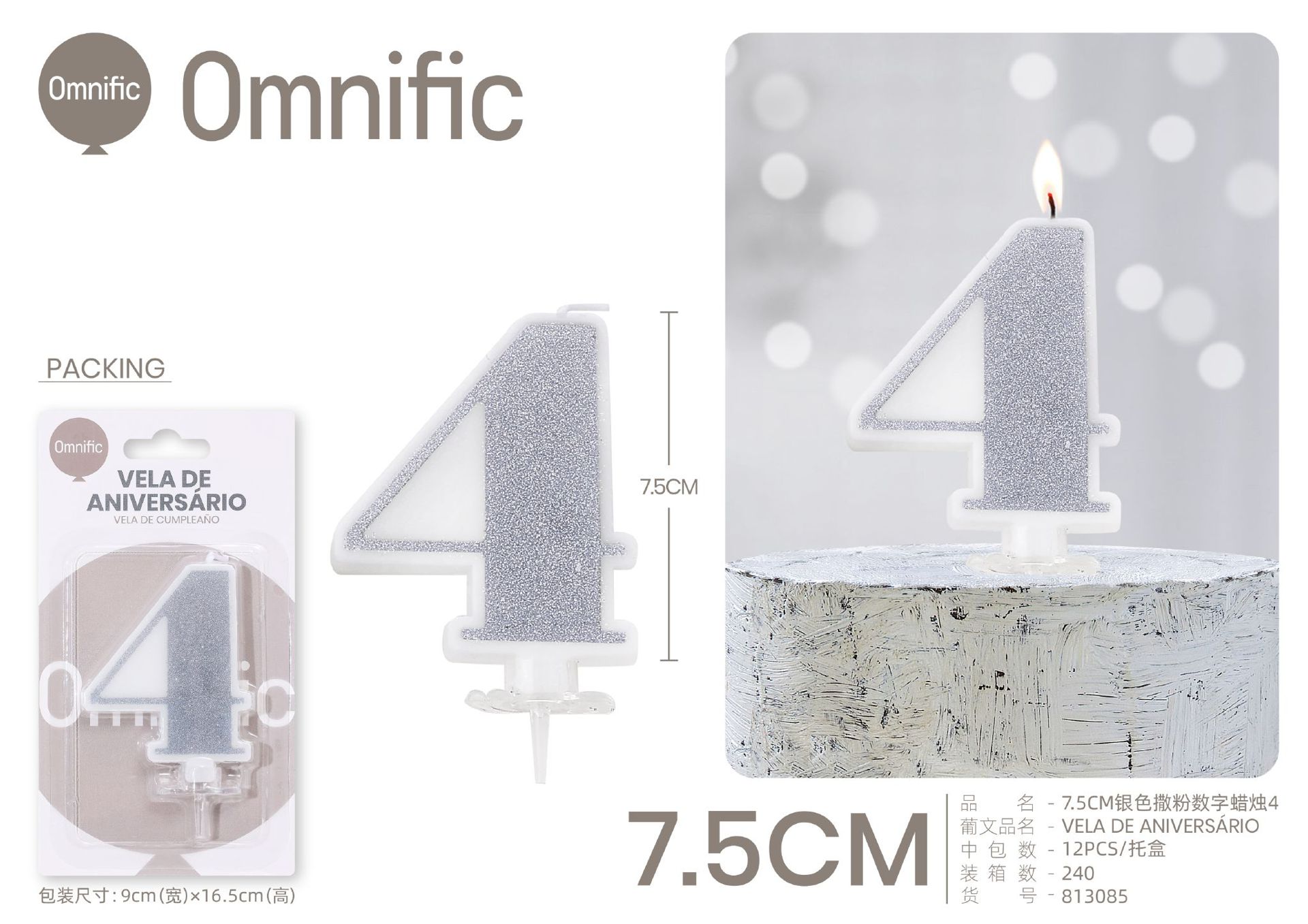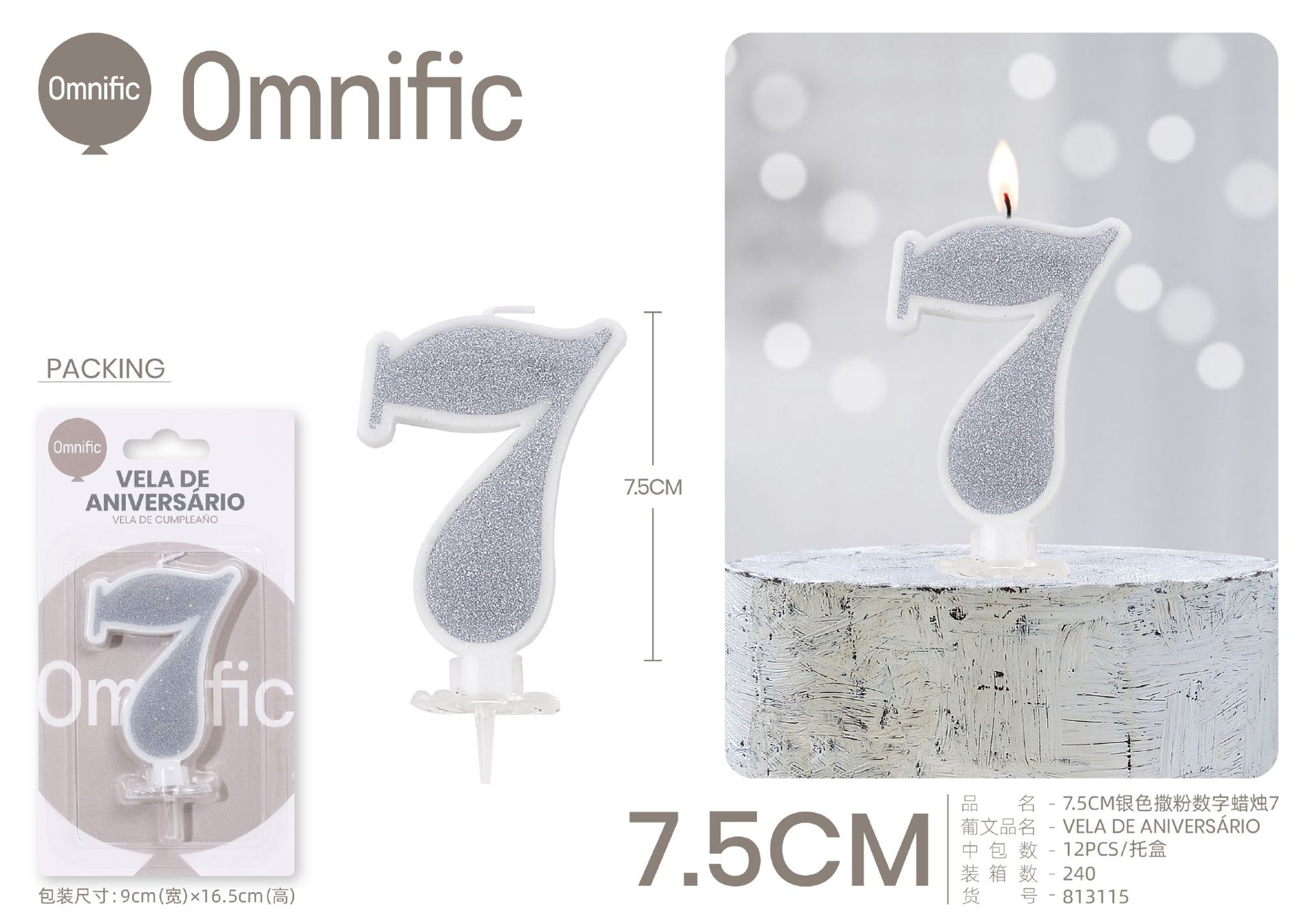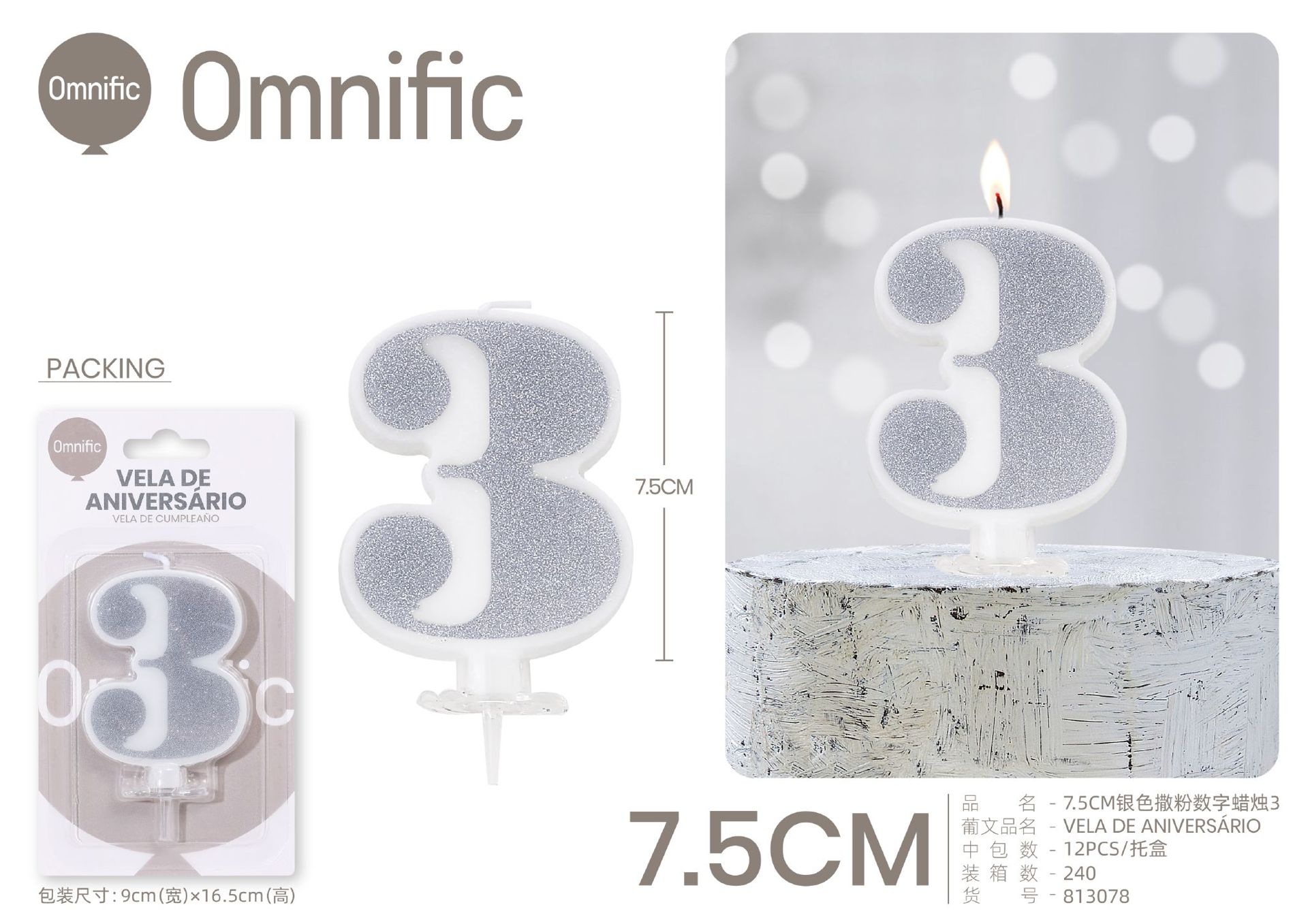 VELA NUMÉRICA PRATEADA COM GLITTER 7,5CM