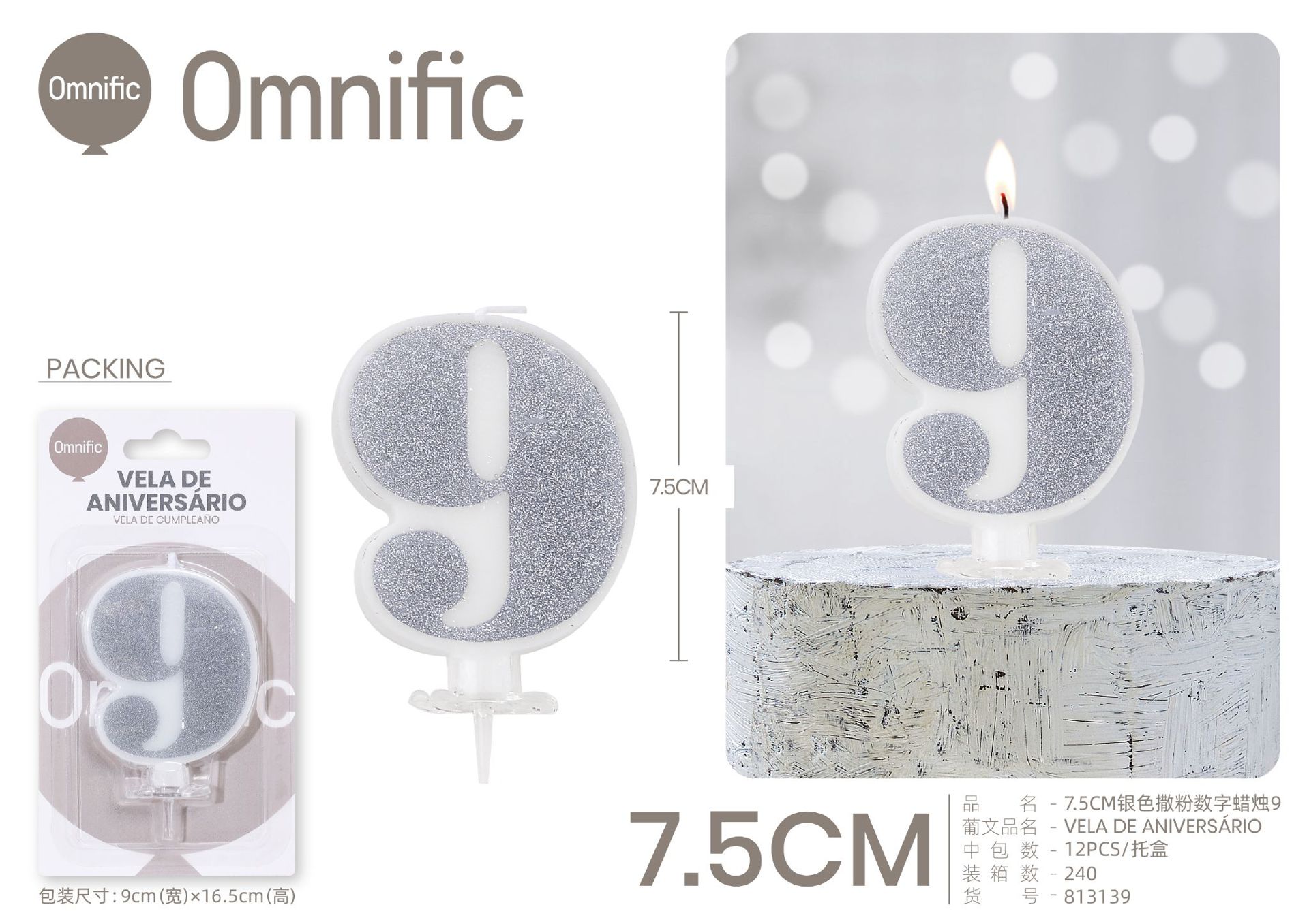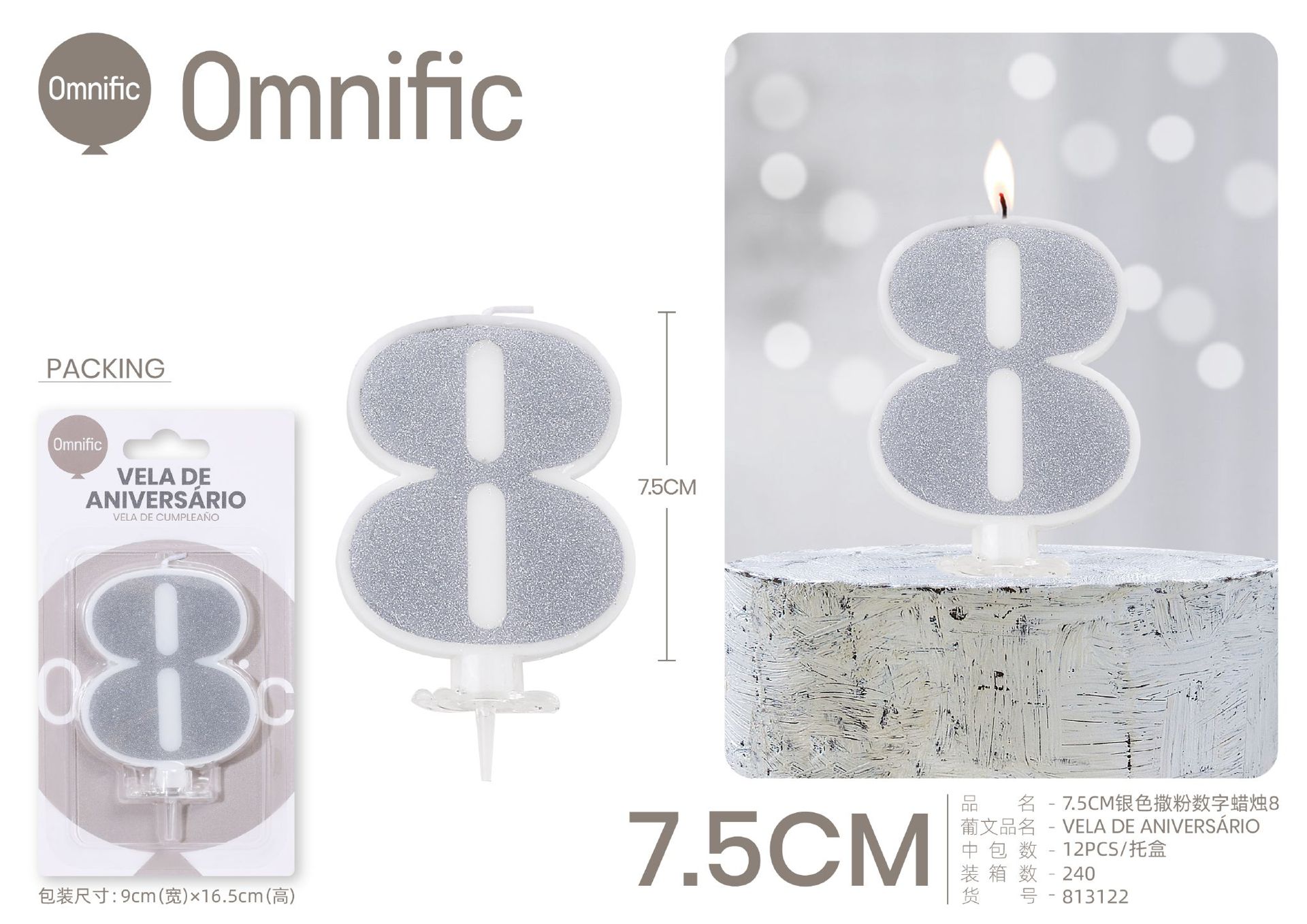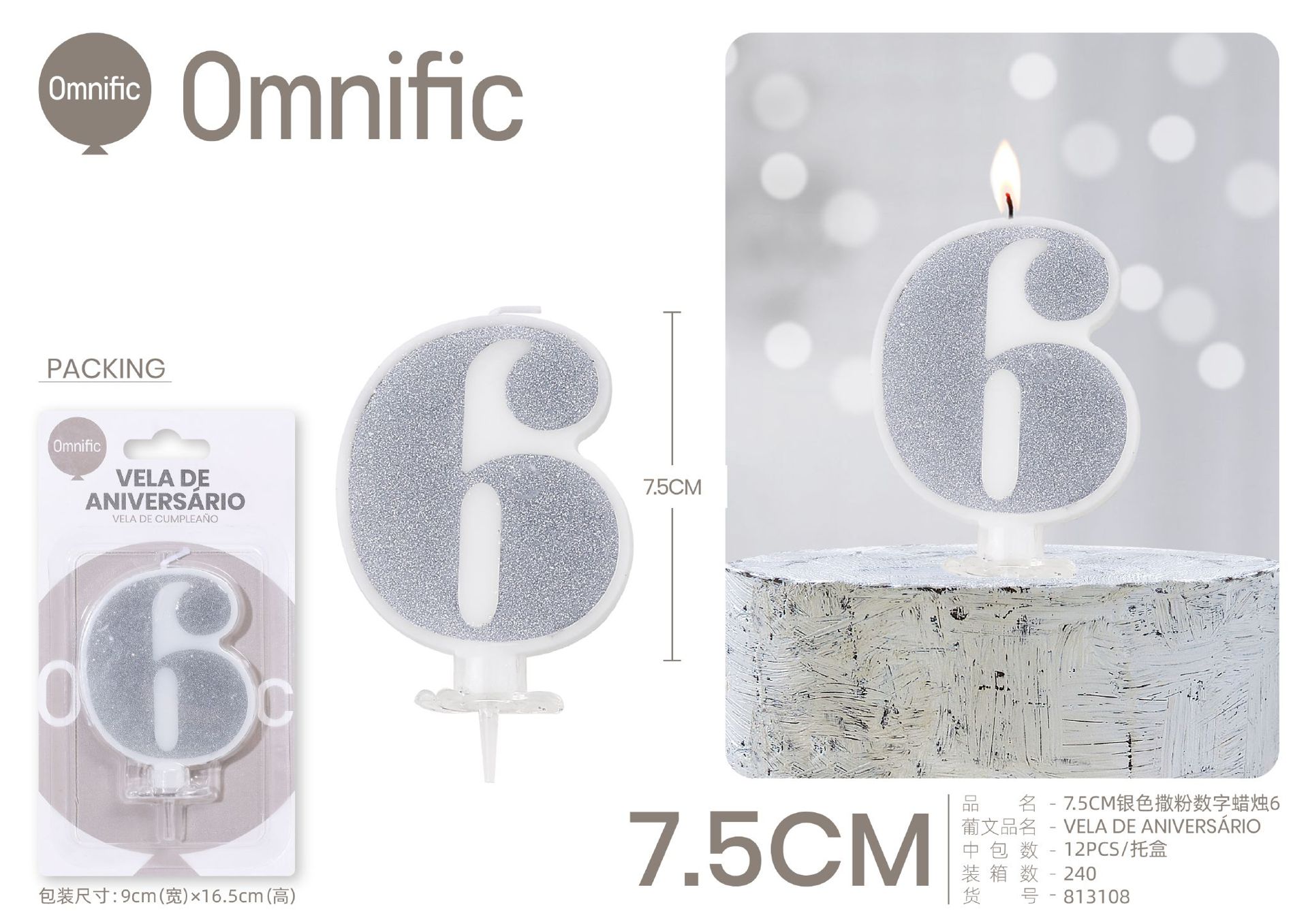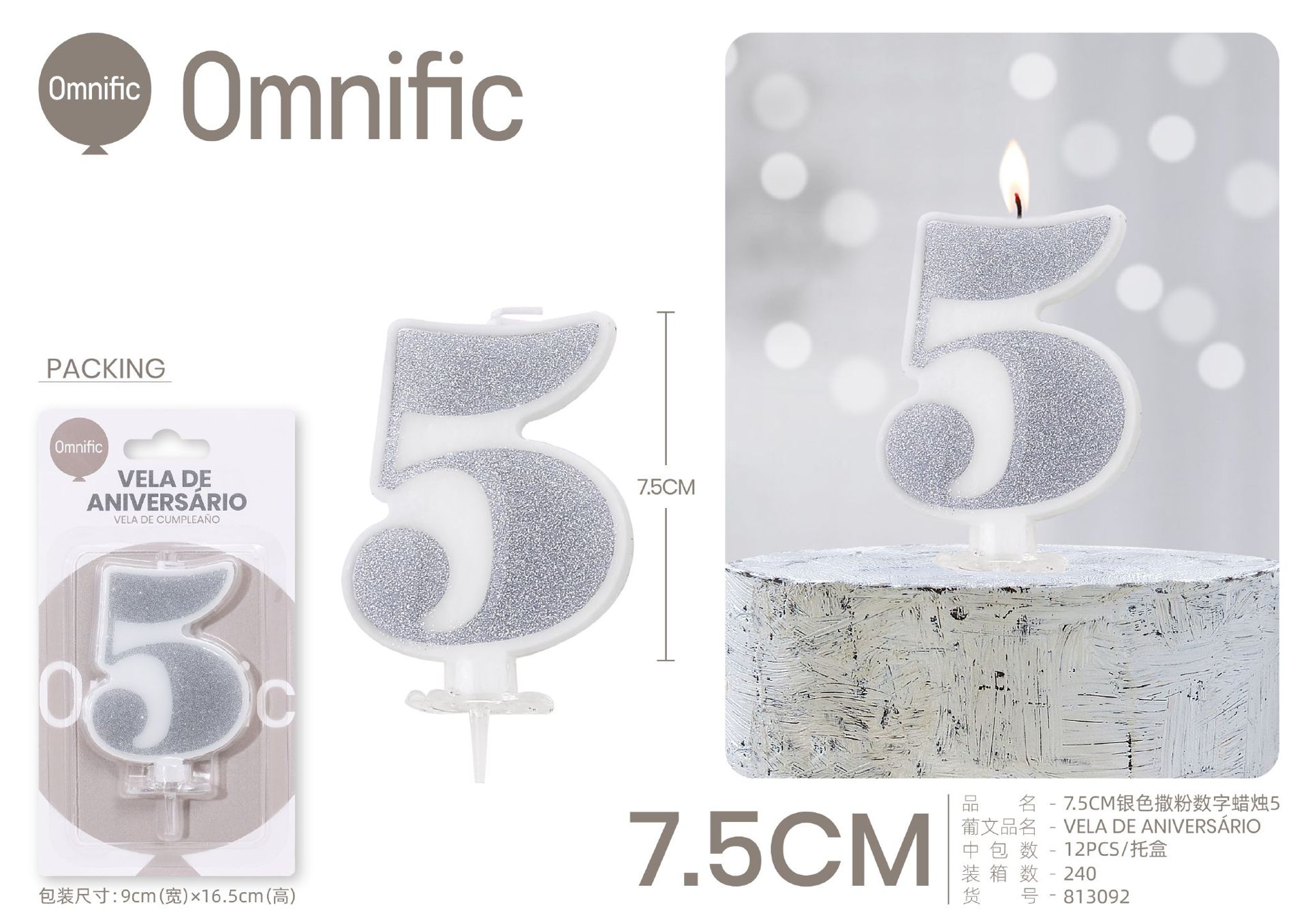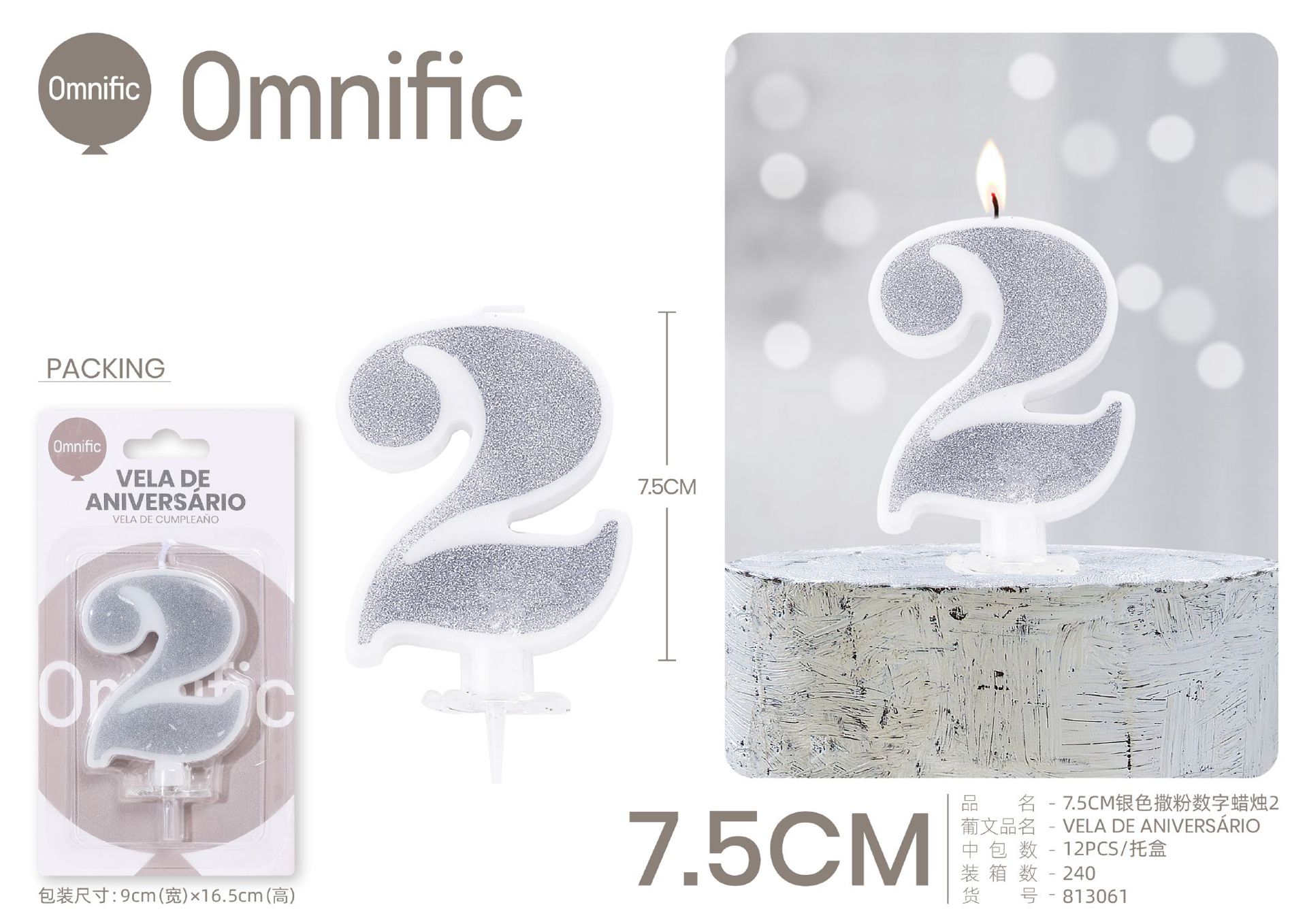 VELA NUMÉRICA PRATEADA COM GLITTER 7,5CM